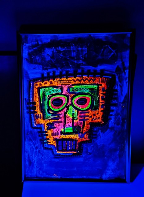 Fargetoner kan avvike noe mellom foto og maleri. Bilde nr 3 illustrerer maleriet under eksponering av UV-lys/blacklight i et mørkt rom. Man må ha UV-lampe for å få denne effekten (medfølger ikke).
