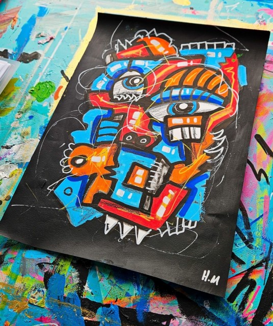 Originalt verk av Håkon Morønning, “Dual Frequency”, uttrykker følelsen av å være delt mellom to indre verdener – to stemmer, to rytmer som kjemper om plass. De intense fargene pulserer mot hverandre som emosjonelle bølger, og de gjennomtrengende blikkene bærer både uro og tilstedeværelse. Et intuitivt, rått og ærlig uttrykk for den energien som oppstår når hjertet og sinnet ikke helt er på samme frekvens.