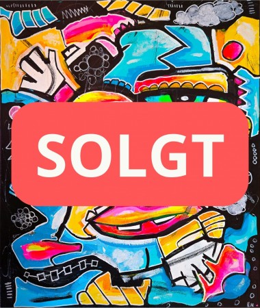 Fargerik street art til salgs, med stort maleri til stuen på 120 x 80 cm (består av to deler). Blandingsteknikker med akrylmaling og oljemaling.