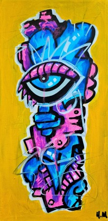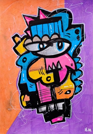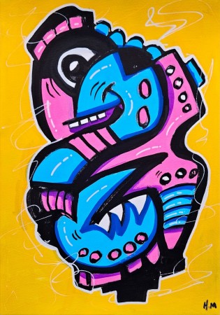 Street art maleri på A3 ark. Fargerik kunst i blått, gult og rosa, med svart bakgrunn. Urban kunst med graffiti uttrykk og gatekunst inspirert. Akrylmaleri som original kunst. Moderne kunst finner du hos Art By Hakon. NB: Ramme medfølger ikke