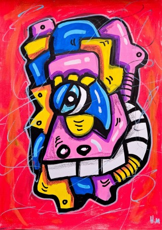 Fargerik kunst med håndmalt maleri i form av akrylmaleri. Kunstverket har sterke farger i rosa, blått, rødt og gult med inspirasjon fra Pop art, street art og ekspresjonisme.