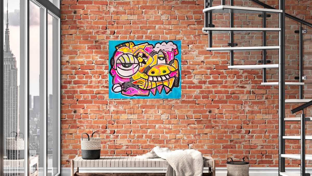 La energien i "Frolic" fylle rommet ditt! Dette fargerike og livlige originalmaleriet skaper et unikt blikkfang med sitt lekne uttrykk og dristige fargevalg. Inspirert av popkunst og street art, kombinerer verket sterke kontraster av rosa, gult og blått, og bringer en følelse av bevegelse og glede. Hvert penselstrøk og hver detalj forteller en historie – en visuell eksplosjon av kreativitet.