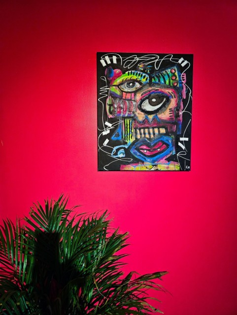 Synapse er et originalt akrylmaleri på lerret som utforsker øyeblikket der persepsjon, følelser og impulser kolliderer. Fragmenterte former og elektriske fargekontraster speiler hvordan tanker beveger seg gjennom sinnet – raskt, lagvis og til tider overveldende. Det ekspressive ansiktet fungerer som et visuelt kart over indre signaler, der intuisjon overstyrer logikk og sansene tar kontroll. Verket inviterer betrakteren til å bli værende i spennet mellom klarhet og kaos, hvor mening føles mer enn den forklares.